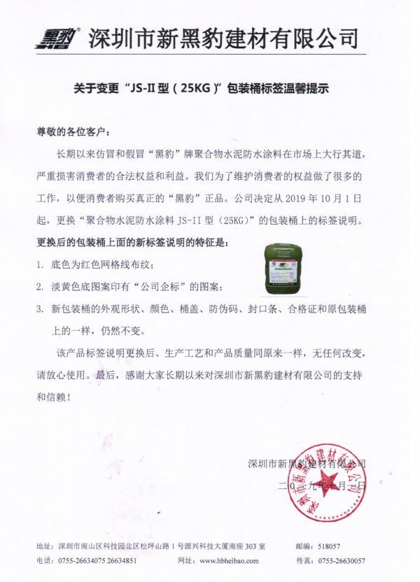 長期以來仿冒和假冒“黑豹”牌聚合物水泥防水涂料在市場上大行其道,嚴重損害消費者的合法權益和利益。我們為了維護消費者的權益做了很多的工作,以便消費者購買真正的“黑豹”正品。公司決定2019101日起,更換聚合物水泥防水涂料JS-II型(25KG)包裝桶上的標簽說明。