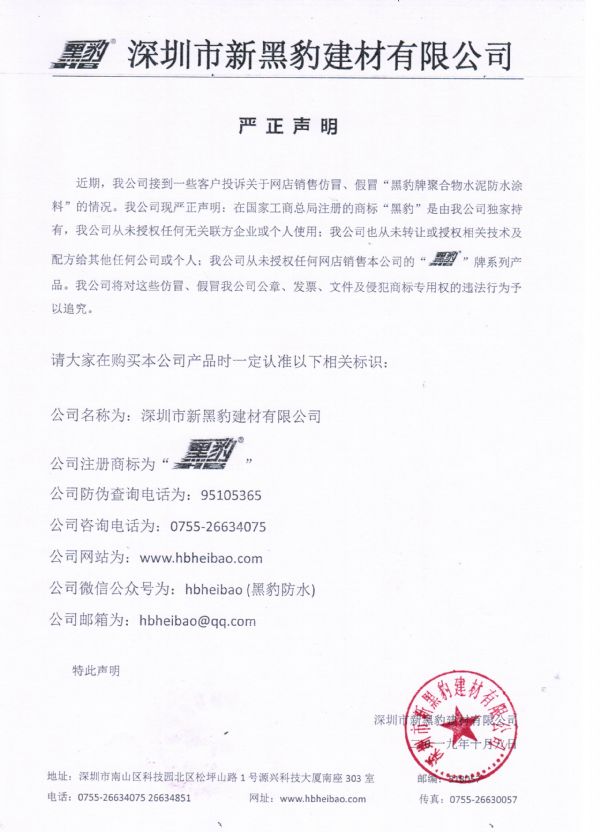 近期,我公司接到一些客戶投訴關于網店銷售仿冒、假冒“黑豹牌聚合物水泥防水涂料”的情況。我公司現嚴正聲明:在國家工商總局注冊的商標“黑豹”是由我公司獨家持有,我公司從未授權任何無關聯方企業或個人使用;我公司也從未轉讓或授權相關技術及配方給其他任何公司或個人;我公司從未授權任何網店銷售本公司的“黑豹”牌系列產品。我公司將對這些仿冒、假冒我公司公章、發票、文件及侵犯商標專用權的違法行為予以追究。 請大家在購買本公司產品時一定認準以下相關標識: 公司名稱為:深圳市新黑豹建材有限公司 公司注冊商標為“黑豹” 公司防偽查詢電話為:95105365 公司咨詢電話為:0755-26634075 公司網站為:www.gdjyxl.com 公司微信公眾號為:hbheibao (黑豹防水) 公司郵箱為:hbheibao@qq.com 特此聲明 深圳市新黑豹建材有限公司 二0一九年十月八日