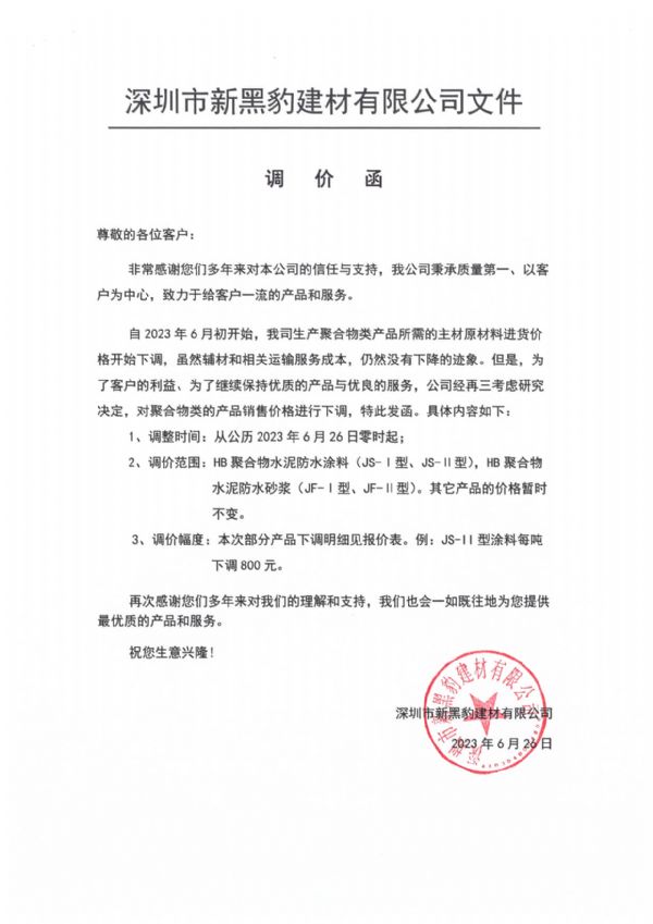 尊敬的各位客戶(hù): 非常感謝您們多年來(lái)對(duì)本公司的信任與支持,我公司秉承質(zhì)量第一、以客戶(hù)為中心,致力于給客戶(hù)一流的產(chǎn)品和服務(wù)。 自2023年6月初開(kāi)始,我司生產(chǎn)聚合物類(lèi)產(chǎn)品所需的主材原材料進(jìn)貨價(jià)格開(kāi)始下調(diào),雖然輔材和相關(guān)運(yùn)輸服務(wù)成本,仍然沒(méi)有下降的跡象。但是,為了客戶(hù)的利益、為了繼續(xù)保持優(yōu)質(zhì)的產(chǎn)品與優(yōu)良的服務(wù),公司經(jīng)再三考慮研究決定,對(duì)聚合物類(lèi)的產(chǎn)品銷(xiāo)售價(jià)格進(jìn)行下調(diào),特此發(fā)函。具體內(nèi)容如下: 1、調(diào)整時(shí)間:從公歷2023年6月26日零時(shí)起; 2、調(diào)價(jià)范圍:HB聚合物水泥防水涂料(JS-Ⅰ型、JS-Ⅱ型),HB聚合物水泥防水砂漿(JF-Ⅰ型、JF-Ⅱ型)。其它產(chǎn)品的價(jià)格暫時(shí)不變。 3、調(diào)價(jià)幅度:本次部分產(chǎn)品下調(diào)明細(xì)見(jiàn)報(bào)價(jià)表。例:JS-II型涂料每噸下調(diào)800元。 再次感謝您們多年來(lái)對(duì)我們的理解和支持,我們也會(huì)一如既往地為您提供最優(yōu)質(zhì)的產(chǎn)品和服務(wù)。 祝您生意興隆! 深圳市新黑豹建材有限公司 2023年6月25日